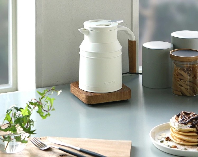 牧場で使われるミルクタンクのようなデザインが愛らしい、「mosh!(モッシュ)電気ケトル」。スピーディーにお湯を沸かせ、日本茶や紅茶、コーヒーなど淹れる飲み物に合わせた3種類の温度設定が可能だ。保温機能付きで、手軽にお代わりができる点もポイント。落ち着いたマットなカラーの本体と、木目柄の電源プレートの組み合わせが美しく、インテリアの一部としてキッチンの景観を引き立てる。ハンドル部分も木目調のデザインで、ナチュラルな雰囲気がアクセントに。容量は約0.8L。