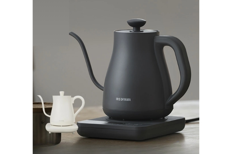 「アイリスオーヤマ」から発売されている、暮らしになじむ小型電気ケトル。温度調節機能と空だき防止機能を備えたスタンダードモデルと、転倒湯漏れ防止構造を備えたハイグレードモデルの2種類がある。電源プレートのパネルは1℃単位で温度調節ができ、粉ミルクやコーヒーなど好みの温度に設定が可能だ。手になじむハンドルと注ぎやすい細口ノズルによりドリップしやすく、コーヒーや紅茶を淹れるのに最適だ。