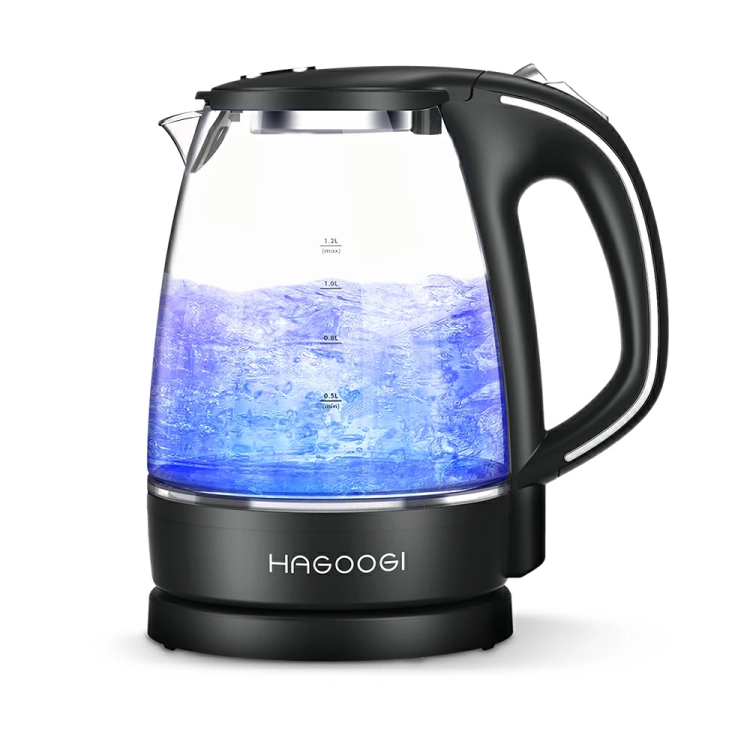 “幸せなキッチンをつくり、より質の高い生活の創造に”をコンセプトに展開するブランド「HAGOOGI(ハゴオギ)」。厚さ3mmの高硼珪酸ガラスを採用し、外側には食品グレードのPP素材を使った二重構造にすることで、お湯を沸かしても樹脂臭さがなく、断熱性も高くなっている。ブルーに光るLEDライトを搭載し、お湯を沸かす際には幻想的な雰囲気に。1.0Lの容量があり、透明なためお湯の量を目視で調節しやすい。
