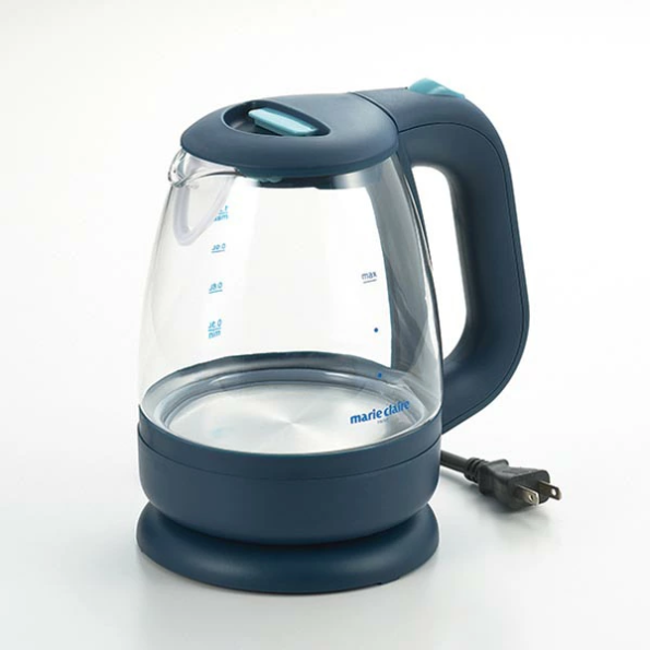 お湯の量や沸き具合を確認しやすいガラス製の小型電気ケトル。水量を確認しやすい水量目盛りを備えている。お洒落な外観が特徴で、スイッチを入れるとLEDが点灯し、暗い場所でも使いやすい。本体のカラーと統一感のある青い光で幻想的な雰囲気を楽しみながら、お湯が沸くまでの時間を過ごせる。