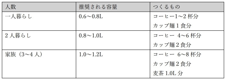 容量が小さすぎると何度もお湯を沸かす手間がかかり、大きすぎるとお湯や電気代の無駄が生じるため、家族構成や使用シーンに適したサイズ、容量の物を選ぶことが重要だ。