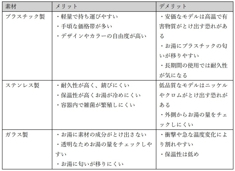 電気ケトルに使われている素材の違いによって、安全性や耐久性が異なる。プラスチック製、ステンレス製、ガラス製のそれぞれの素材の特徴は下記の通りだ。
