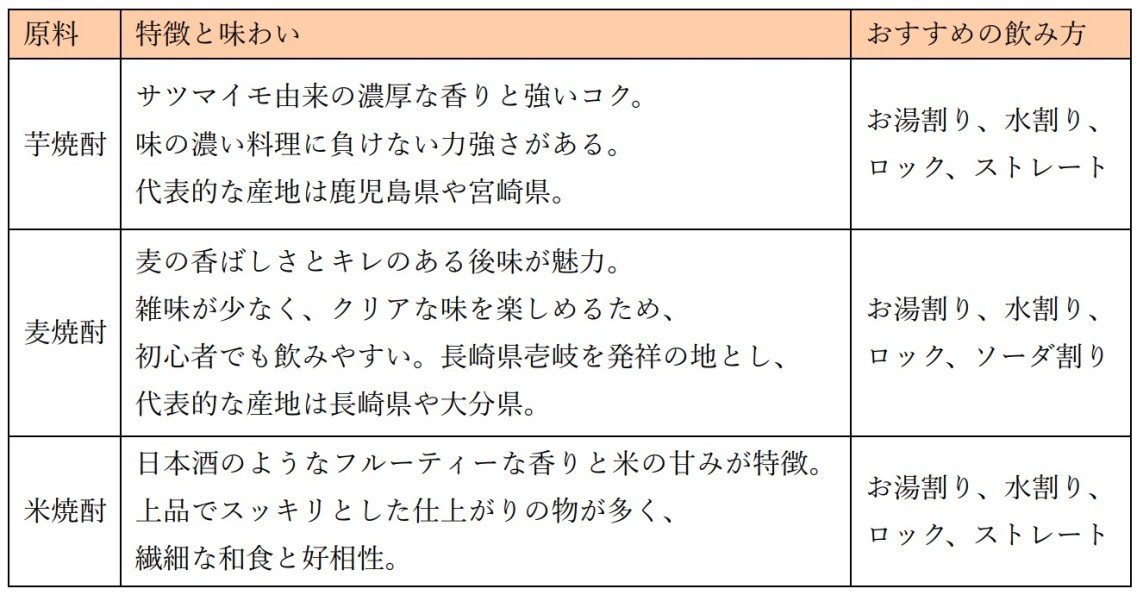 焼酎の個性を決定づける最大の要素は、主成分となる原料だ。焼酎の原料には主に、芋、麦、米が使われており、贈る相手や自身の好みの味わいを把握することが、失敗しない選び方の第一歩になる。