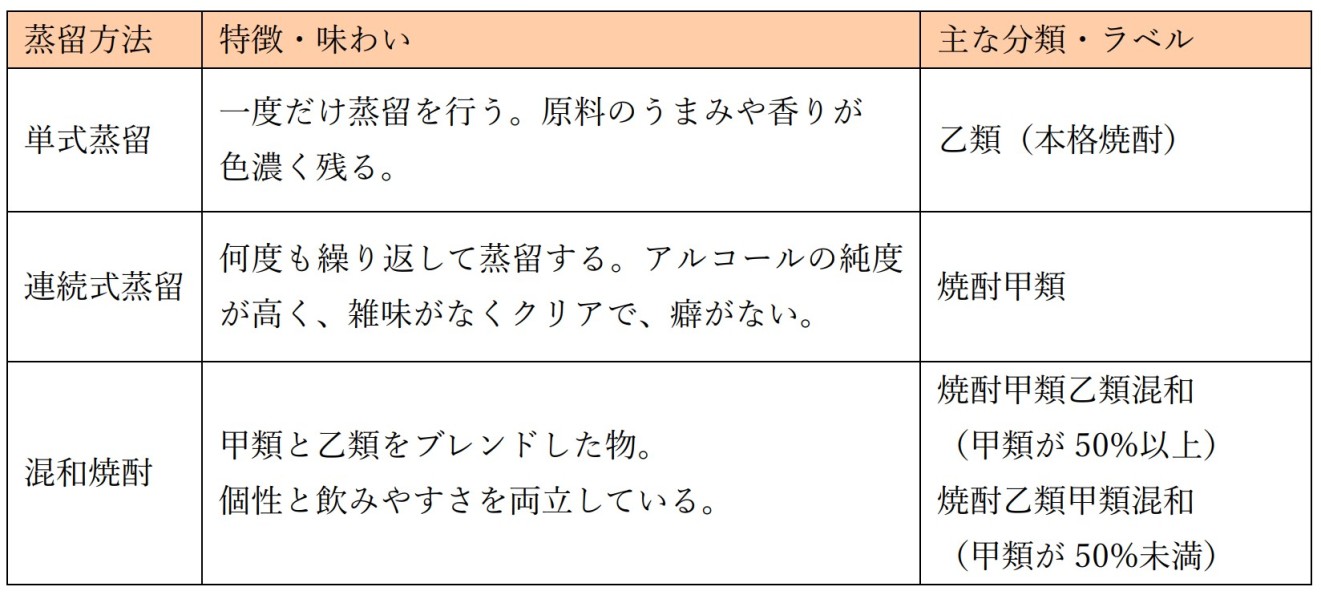 乙類は単式蒸留を採用することで、原料由来の香味成分をしっかりと保つ。原料の個性が色濃く残るため、芋や麦の本来の持ち味が際立つ。一方、甲類は連続式蒸留によって不純物を取り除き、高純度のアルコールを抽出する。癖が少なく非常にクリアな味であり、サワーやカクテルのベースに向いている。混和焼酎はその両方を独自の比率でブレンドしたタイプとなっている。