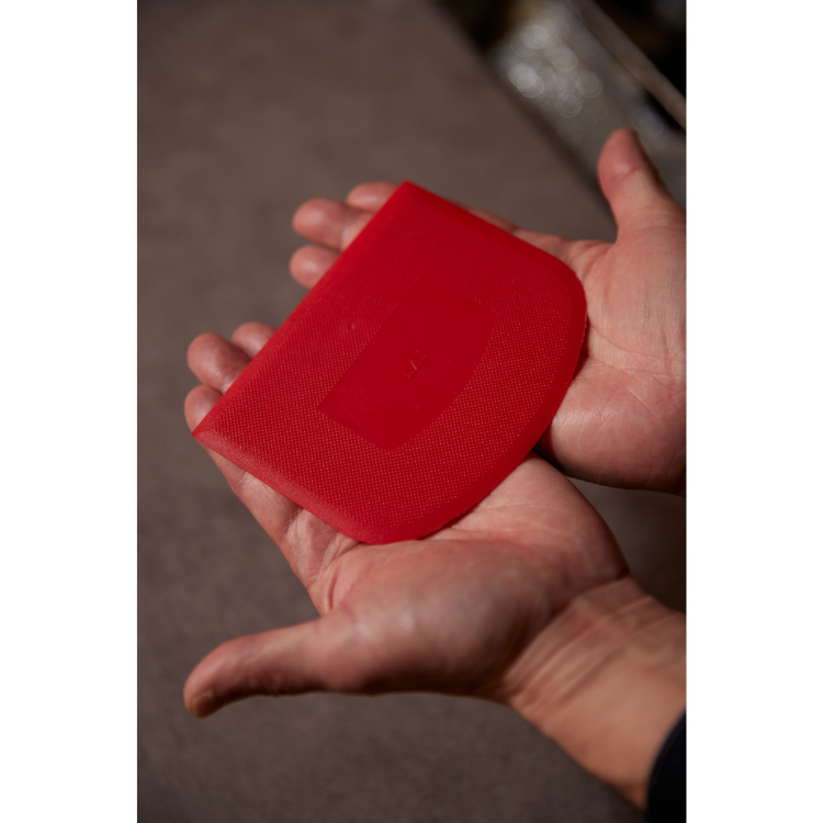 これも昔から使っている貝印のスクレッパーです。もともとは生地を切ったり、ならしたりする製菓用のアイテムですが、包丁で切ったものをフライパンや鍋に入れる際に使っています。みじん切りした小さな野菜とかでもサッと集めることができて便利です。