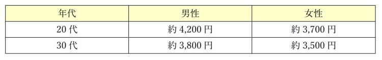 年代別にみると、20代の平均予算は約3,900円、30代は約3,600円となっている。意外にも、30代より20代の方がやや高めの予算をかけており、男女差は大きくないものの、いずれの年代でも男性のほうがやや高額な傾向が見られる。