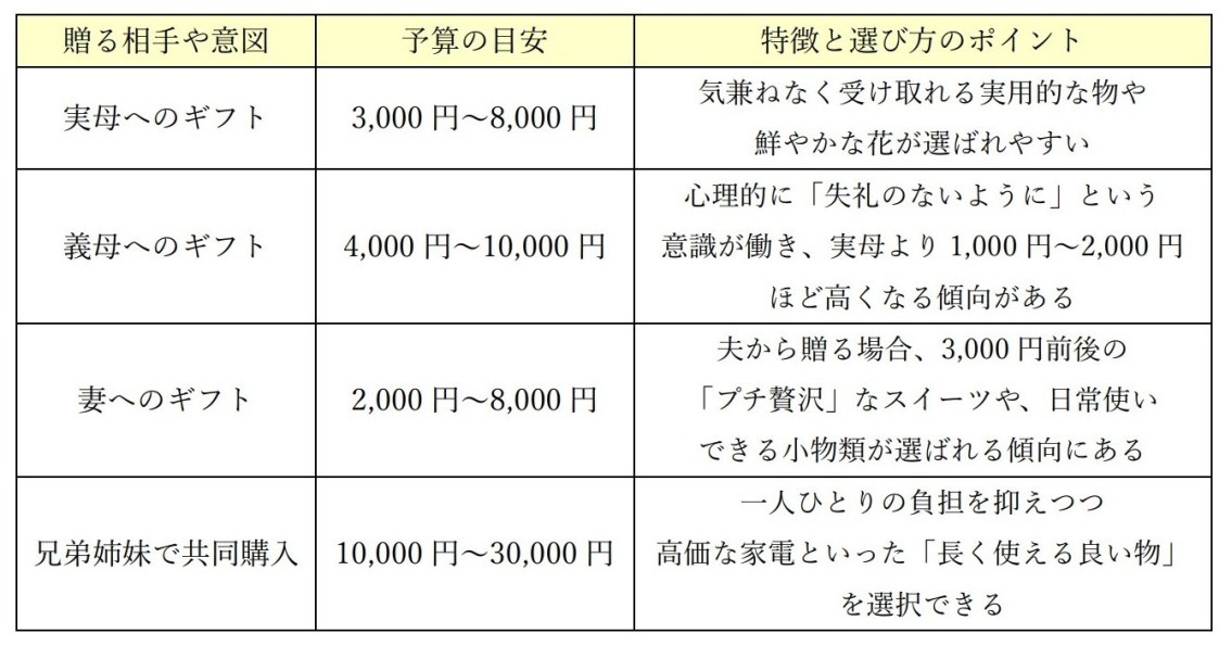 このように、贈る相手との関係性や心理的な距離感によって、予算の立て方は大きく変わる。実母には気兼ねのない実用的な物を選べる一方で、義母への贈り物は礼儀を欠かさないよう慎重に検討する心理が働くため、実母より高価格帯を選ぶ傾向がある。
