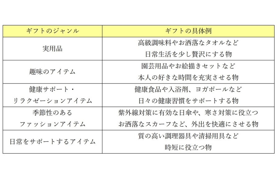 母親や妻の好みや生活リズムを考慮することが、母の日のギフト選びの基本となる。相手の日常になじまない贈り物は、管理の手間や心理的な負担につながる恐れがあるためだ。生活習慣に寄り添うギフトを選ぶことは、日々に感謝しているという真心の証明になる。具体的なギフトのジャンルについては、以下の表を参照してほしい。
