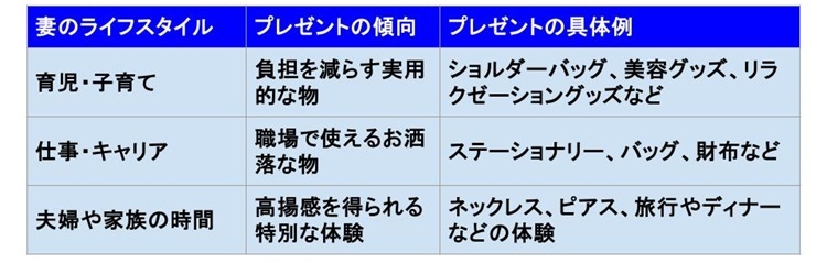 子育て中であれば、両手が自由になるショルダーバッグのような、利便性に優れたアイテムが重宝される。キャリアを積む女性には、仕事へのモチベーションを高める上質なステーショナリーやバッグ、財布などが選択肢になるだろう。プライベートな時間は妻を一人の女性として尊重し、上質なアクセサリーを贈るのも良い。労いの気持ちを込めて、レストランでの食事や家族旅行などを提案し、息抜きをしてもらうことも大切だ。