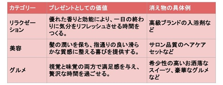 自分ではなかなか購入しない上質な消耗品やグルメは、最終的に形としては残らないが、使用した際の心地よさや心身をリフレッシュさせる体験、美味しさの記憶として深く刻まれる。多忙な毎日の中で自分を労わる時間をつくるきっかけを贈ることは、真摯な労いを感じさせる洗練されたプレゼントになるだろう。