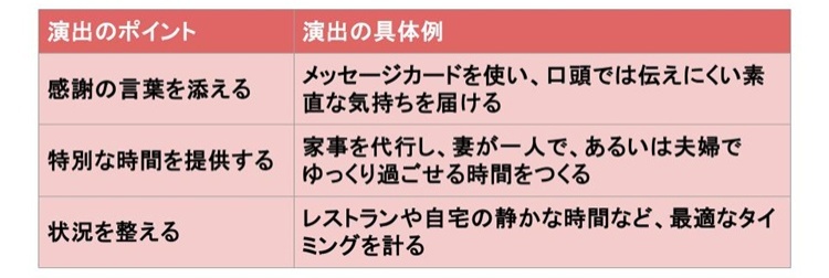 驚きを提供するサプライズも効果的だが、相手の気持ちに寄り添った穏やかな時間をつくることも、忘れられない思い出になるだろう。夫婦や家族で過ごす時間をプレゼントとして設計するのも、非日常感を味わえるため効果的だ。