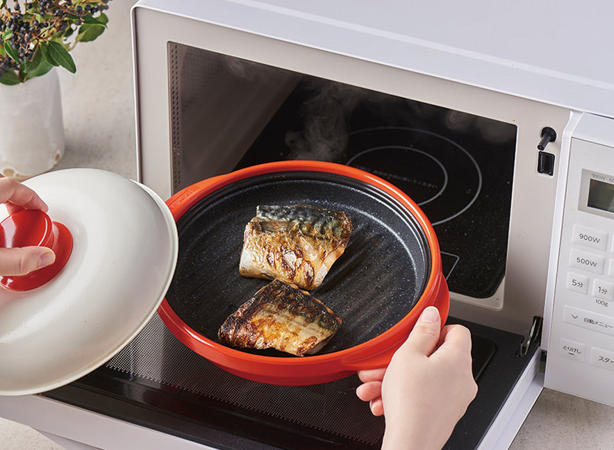 フライパンで焼いたような本格的な調理ができる電子レンジ専用の調理器。本体内部の蓄熱ヒートコアがマイクロ波に反応し、グリルで焼いたような香ばしい焼き目をつけながら、ふっくらと美味しく仕上げられる。プレートにはフッ素樹脂コーティング加工を施しており、調理後の汚れも落としやすい。丸洗い可能なため、手入れも簡単だ。
